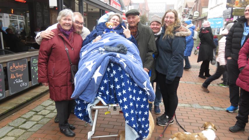 Gemeinsam machten wir uns auf den Weg zum Hundestrand. In einer fröhlichen Gruppe von zwanzig Personen ging es Richtung Deich. Veras Gesicht erstrahlte, als sie die salzige Nordseeluft einatmete. Es war, als ob der Wind all die Erinnerungen an ihre Kindheit und vergangene Urlaube heraufbeschwor. Die Zeit am Deich war erfüllt von herzlichen Gesprächen, Erinnerungsfotos und fröhlicher Musik. Es wurde gelacht, getanzt – ja, auch auf unserer Liege ließ sich das nicht verhindern – und der Moment, dieser kostbare Augenblick, wurde in vollen Zügen genossen.