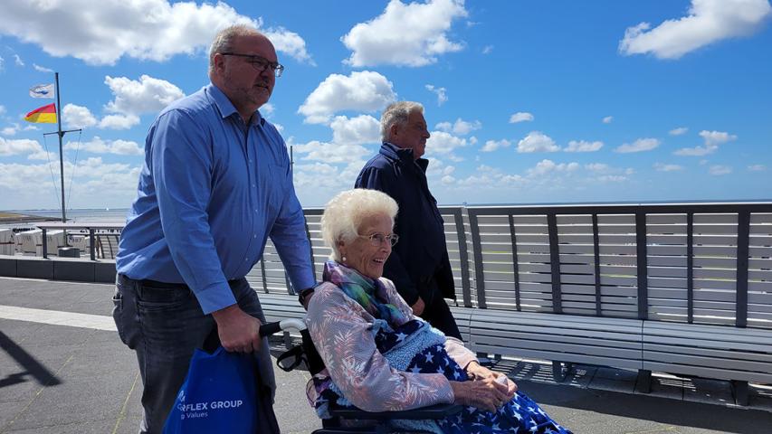 Die Zeit verging wie im Fluge und wir machten uns langsam auf den Rückweg zum Auto. Aber halt, das Wichtigste fehlte ja noch! Kurze Zeit später hielt Frau B. freudestrahlend ihr lang ersehntes Krabbenbrötchen in der Hand. Noch ein gemeinsames Abschiedsfoto und der Rückfahrt stand nichts mehr im Wege. Für einen musikalischen Ausklang des Tages sorgten Frau B. und ihr Sohn, die gemeinsam im Wünschewagen Lieder wie „Wunder gibt es immer wieder“ von Katja Ebstein und „Über den Wolken“ von Reinhard Mey sangen. Zum Schluss hörten wir „Liebeskummer lohnt sich nicht“ von Siw Malmkvist. Dem stimmten wir zu, Liebeskummer lohnt sich nicht. Aber eine letzte Fahrt nach Büsum auf jeden Fall. Und das wusste auch Frau B.