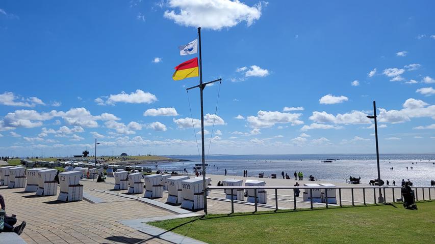 „Geht nicht, gibt’s nicht. Es gibt immer einen Ausweg“, meinte mein Wunscherfüller-Kollege Helmut zu mir. Und er sollte Recht behalten. Nach ein paar Telefonaten hatten wir die Erlaubnis, über den Deich direkt ans Wasser zu fahren und dort zu parken. Von hier aus starteten wir dann unseren Spaziergang an der sonnigen Promenade Büsums entlang. Zwar hatten wir zu dem Zeitpunkt Niedrigwasser, aber das sollte kein Problem sein. Schließlich meldete sich der Hunger langsam zu Wort, deswegen steuerten wir direkt die Osteria an. „Einmal Currywurst mit extra vielen Pommes für mich, bitte!“, Frau B. wusste genau, was sie wollte. Vermutlich hat unser Kellner den exakten Wortlaut an die Küche weitergegeben, denn als er unserem Fahrgast den riesigen Teller servierte, brachte sie nur ein fassungsloses: „So viele Pommes auf einmal habe ich noch nie in meinem Leben gesehen!“ heraus.