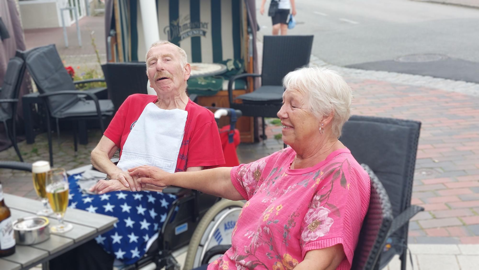 In Büsum angekommen, begrüßte uns die See mit auflaufendem Wasser und die Sonne strahlte am blauen Himmel – perfektes „Wünschewagenwetter“. Wir gönnten uns eine Mahlzeit mit Blick auf das endlose Meer. Für Jörg gab es Pommes, wie er sie immer geliebt hatte. Während wir aßen, spürten wir die Ruhe, die nur das Meer und die Nähe zu geliebten Orten schenken kann.