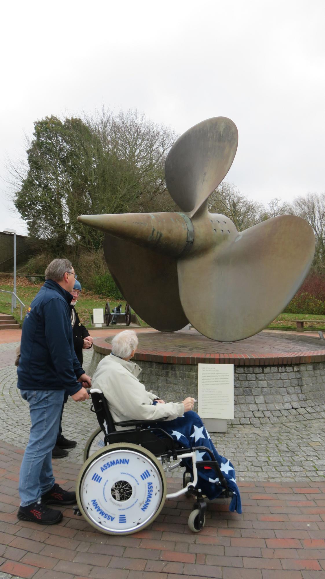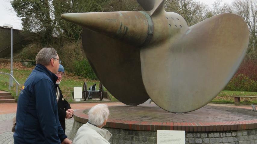 Angekommen am Marine-Denkmal war die Aufregung spürbar. Unser Fahrgast staunte über die Größe der Anlage und die vielen Exponate auf dem Vorplatz, darunter eine riesige Schiffsschraube, die majestätisch im Sonnenlicht glänzte. Wir fühlten uns herzlich eingeladen vom Deutschen Marinebund e.V., der uns diesen besonderen Tag ermöglichte – ganz ohne Kosten.