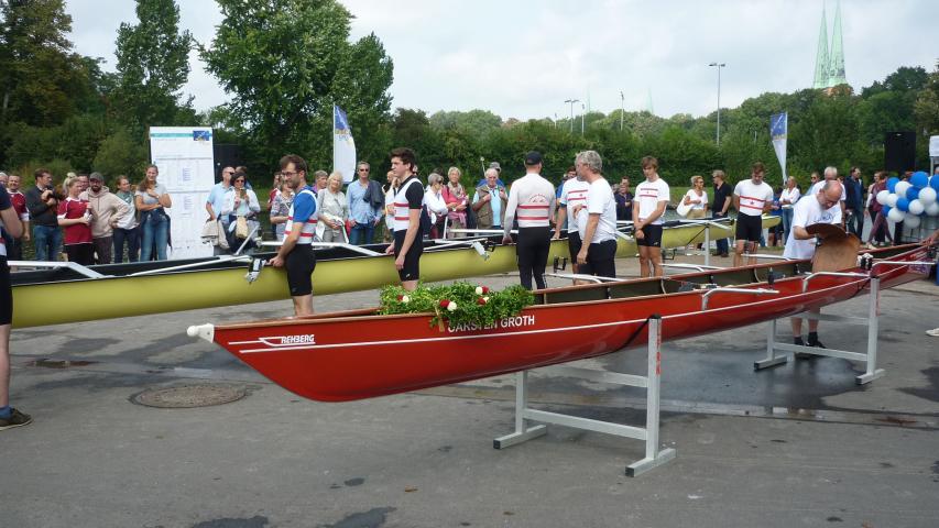 Gemeinsam mit seiner Ehefrau und unseren beiden Wunscherfüllern Eva und Jonas ging es an die Kanal-Trave, wo schon die ersten Boote in Stellung gebracht wurden. Bevor wir überhaupt aufs Gelände kamen, wurden wir von einem alten Freund der Familie in Empfang genommen und Herr Z. mit einem offiziellen weißen T-Shirt der Helfercrew ausgestattet. Die Sportler waren an diesem Tag mit blauen Shirts ausgestattet.