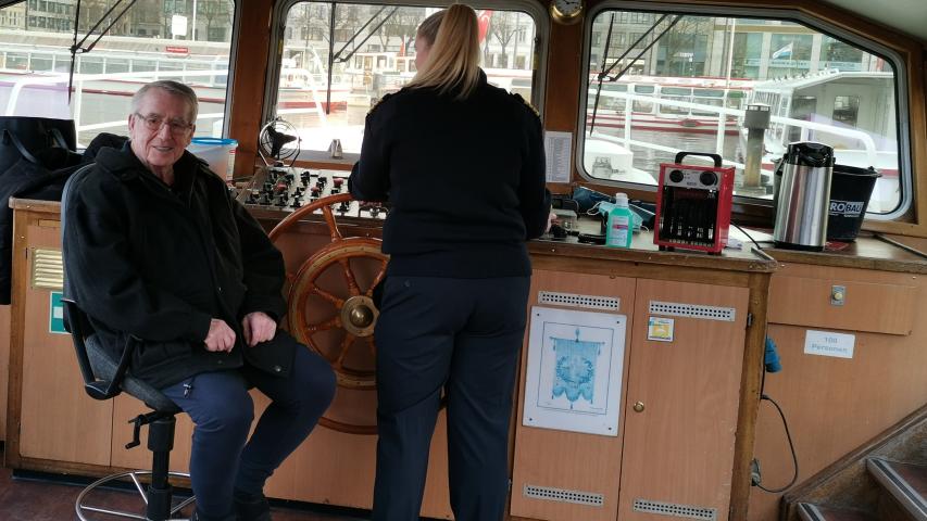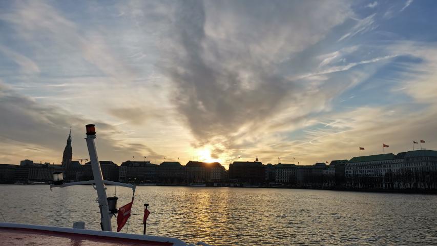 Danach stand das Highlight des Tages bevor: Eine zweistündige Alsterrundfahrt mit der Enkeltochter, welche Bootskapitänin ist. Aufgrund dessen hatten wir das Schiff ganz für uns alleine, was für uns alle eine neue Erfahrung war. Während die Enkeltochter noch ihre Uniform anzog, machten wir uns mit Herrn S. schon auf den Weg ins Boot, welches bereits eingeheizt war. Die Tochter hatte noch diverse Süßigkeiten und Getränke mitgebracht, so dass es bei dem tollen Wetter ein schöner Nachmittag werden MUSSTE.