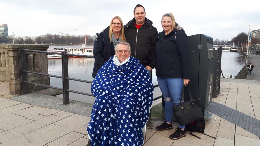 „Obwohl wir ein wenig zu früh vor Ort waren, war Herr S. schon bereit zur Abfahrt. Das Pflegepersonal erzählte uns, wie sehr er sich schon auf den Tag freute. Nach einem kurzen Telefonat mit der Tochter machten wir uns mit unserem Fahrgast auf den Weg nach Hamburg, wo wir freundlicherweise direkt bei der ATG an der Alster parken durften. Vor Ort erwarteten uns schon die Tochter sowie zwei seiner Enkelkinder, mit denen es dann im Rollstuhl und zugedeckt mit der Kuscheldecke auf die andere Straßenseite zum Restaurant Blockhouse ging. Dort wollte Herr S. gerne nochmal ein leckeres Steak essen. Wir waren ein wenig zu zeitig vor Ort, so dass wir noch ein paar Minuten an der kalten Luft, aber dafür mit Sonnenschein warten mussten.