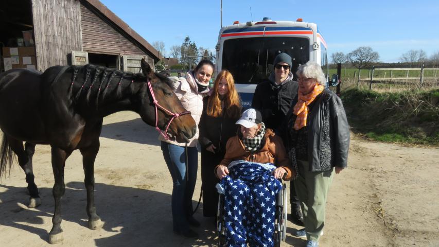 Auf dem Hof warteten bereits die Tochter und der Schwiegersohn – und natürlich Emma, das Pferd. Nun war die Freude bei Herrn D. riesengroß. Die beiden mögen sich sehr, das ist auch für Außenstehende unschwer zu erkennen. Auch für unsere Wunscherfüllerinnen war es wunderschön, das Leuchten in seinen Augen zu sehen, als er dem sanften Vierbeiner eine Möhre reichte, seine gedankenverlorene Freude zu erleben. Das war eine rundum gelungene Überraschung.