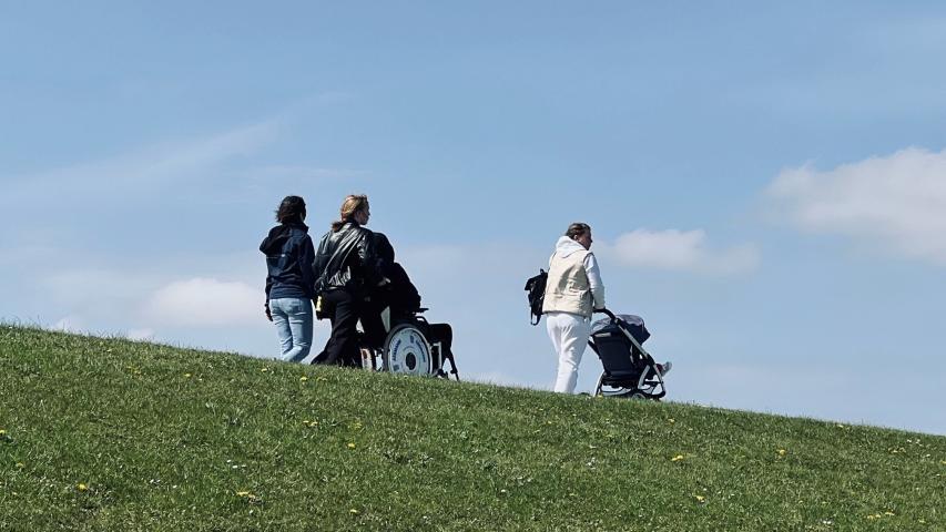 Mit Rolli und Buggy ging es am und auf dem Deich weiter Richtung Binnenhafen, während der Wünschewagen in gebührendem Abstand der kleinen Wandergruppe folgte. Strandkörbe, Watt, Seezeichen und Schiffe; was es hier alles zu sehen gab. Nur die Seehunde spielten heute Verstecken.